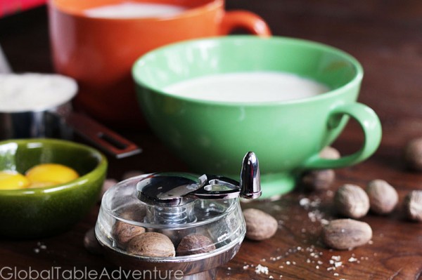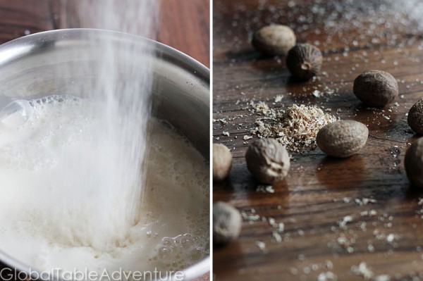 - Heat the milk and heavy cream with half of the sugar, reserving the rest for later, and 1 tsp freshly ground nutmeg. Remove from heat when the sugar is dissolved. Do not boil.