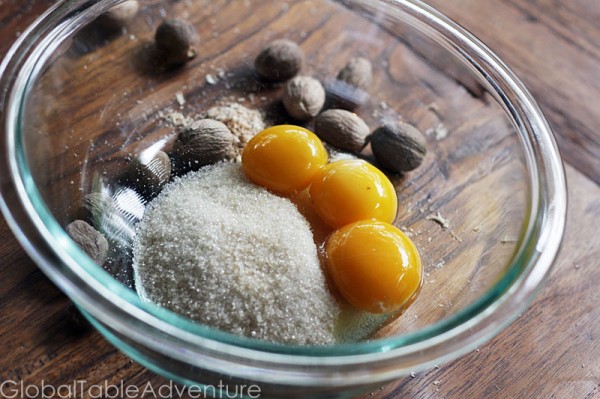Heat the milk and heavy cream with half of the sugar, reserving the rest for later, and 1 tsp freshly ground nutmeg. Remove from heat when the sugar is dissolved. Do not boil.