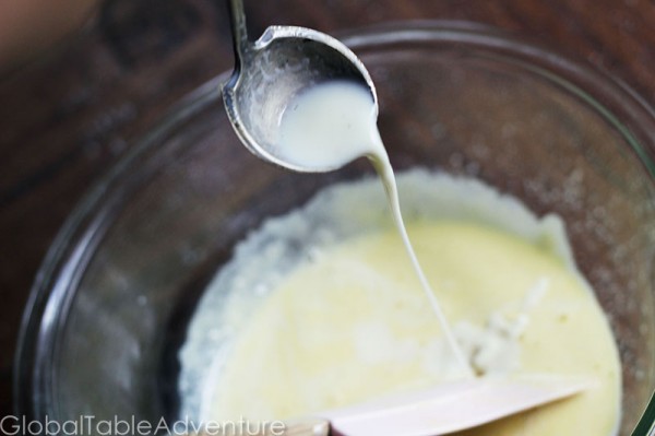 - Stream a few tablespoons of the hot milk mixture into the egg yolk mixture and whisk to combine.