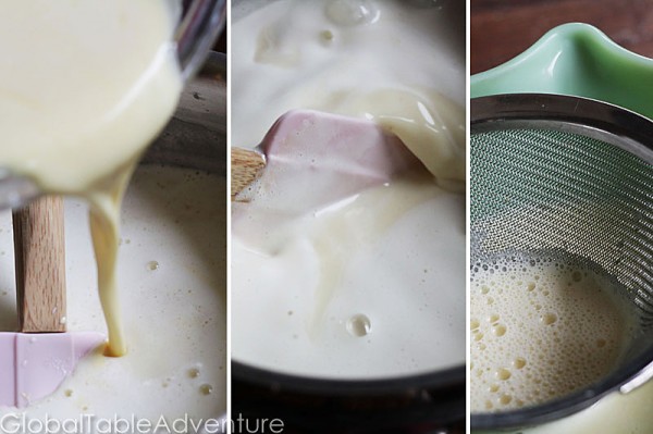 - Pour this mixture back into the pot. Return to heat and cook over a medium-low flame until thickened (this will usually happen a minute or so after the first bubbles break through). Stir continuously. Once thickened, strain all the goupy stuff out.