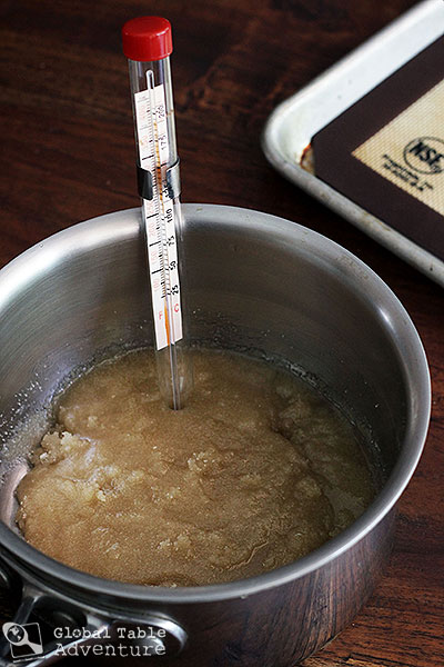 In my reading, I found that many people have trouble making this sweet treat, even though there are only three ingredients. As with any candy making, a good candy thermometer is a great idea, although I double checked my reading by dropping the candy into a bowl of ice water and found that to be more reliable.