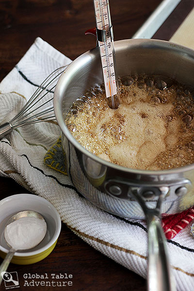 1. First step – prepare a lined baking sheet that will be quick and easy to reach from your stovetop. Like lightening quick. Then mix the honey and sugar together in a fairly large pot (you’ll see why in a moment). Add the candy thermometer and heat over medium high for about five minutes or until 300F (a.k.a. hardball candy stage) and when a little is dropped into ice water off a spoon, it forms a hard ball. I highly recommend doing the ice water test even if the thermometer reads 300F because you might have it sitting in a hot spot (or a cold spot). I had to cook mine a little longer than my thermometer suggested because of this. If it doesn't get to hard ball, the candy won’t harden properly and will come close to pulling your teeth out.