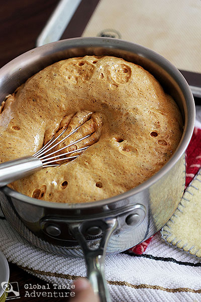 Now, remove the thermometer and whisk in the baking soda. Quickly.
