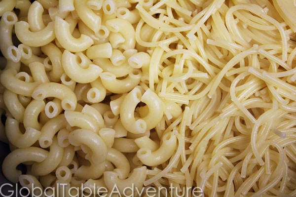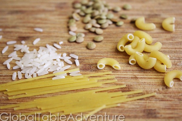 - Cook the macaroni, pasta, rice, and lentils according to package directions.
