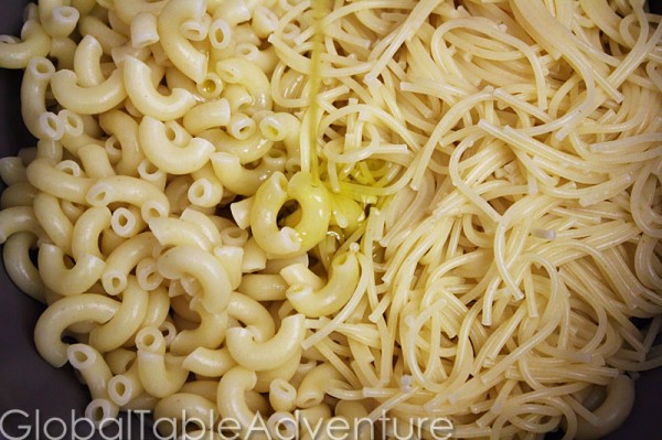 - Place cooked and drained pasta in a bowl, drizzle with olive oil and season with salt.