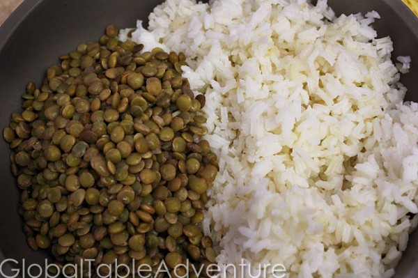 Next, toss the cooked rice and lentils together.
