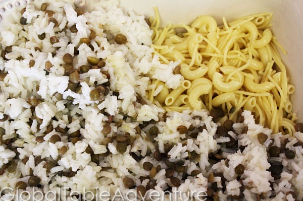 - Toss the cooked rice and lentils together then layer it on top of the pasta.