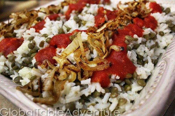 In Egypt, there are entire restaurants devoted soley to the production of Kushary. Giant vats are filled with the necessary ingredients and kept warm over low heat. With each order, a quick-moving server walks their ladle through the vats, filling the customer’s bowl up to the brim with pasta, rice, lentils, spicy tomato sauce, and fried onions. While it is difficult to reproduce this type of assembly at home, it is possible to layer all the ingredients in a casserole and keep warm. This is how we’ve approached this mega popular Egyptian dish.