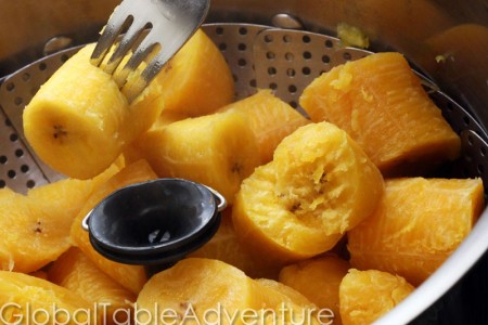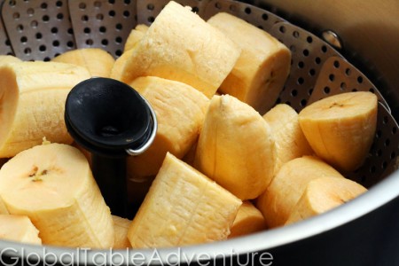 - Peel and chop the plantains into even sized pieces and steam for 25-35 minutes, or until a fork pierces them with no resistance.