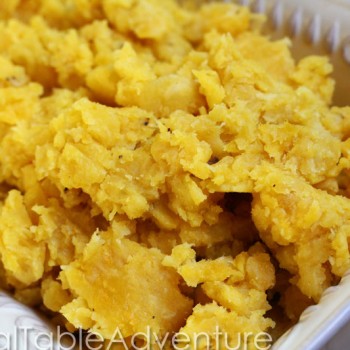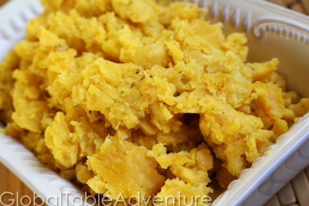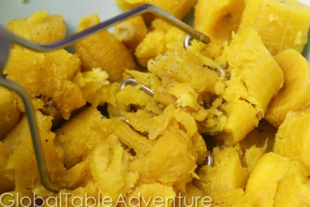 The plantain’s dense texture makes this a particularly hearty side dish. Our version is a rather coarse mash – like extra heavy duty mashed potatoes. You could keep going until it s as smooth as you’d like (you may need some hot liquid, like milk or stock, to help though).