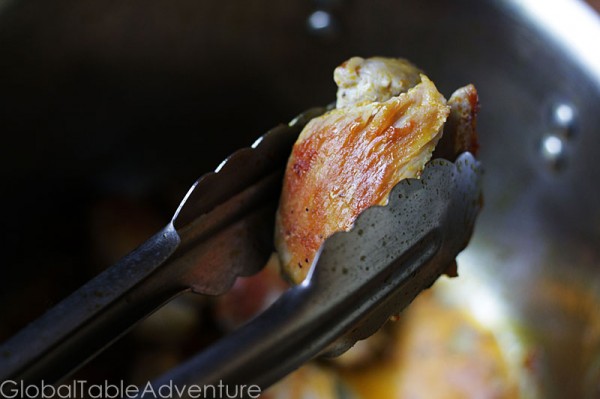 Brown boneless chicken thighs or veggies in vegetable oil over medium high heat (in batches, as necessary).