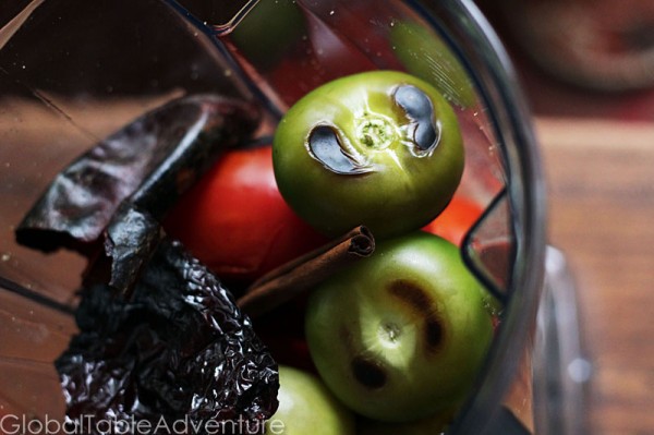 Let’s get to work – first, roast everything in a happy, ungreased comal (you could also use a dry skillet) over medium-high heat. Start with the tomatoes, tomatillos, dried peppers and peppercorns. Set them aside once they are blackened.