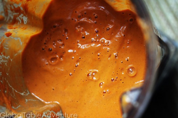 Once you get a nice, fine grind, pile on the rest of the ingredients… don’t forget the peppercorns, cinnamon stick and water (or stock). If you’re blender is a bit on the weak side, you might want to chop things up a bit first to help it along.
