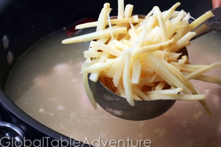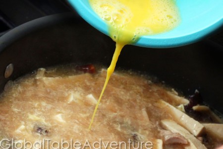 Bring to a simmer. Add beaten eggs while stirring the soup. This will make shredded lines of egg throughout the soup.