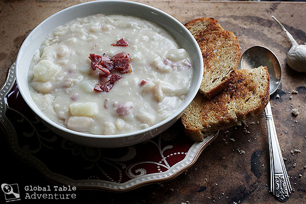 The main flavor is of the creamy potatoes and beans, smoky bacon, with the vinegar creeping in the background.