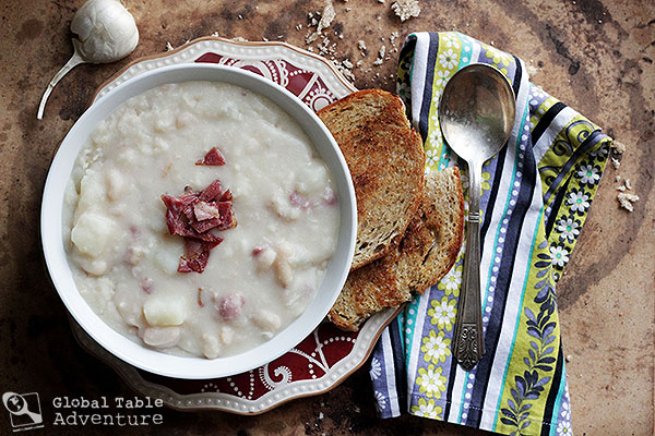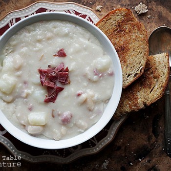 While the house slumbers under the bright moon, a quiet bowl of bean sits in the shadows, soaking overnight. In the morning, after a big stretch, the softened beans are put to a bubble with bits of bacon (or perhaps a ham hock), potato, and – not to be forgotten – a splash of vinegar.