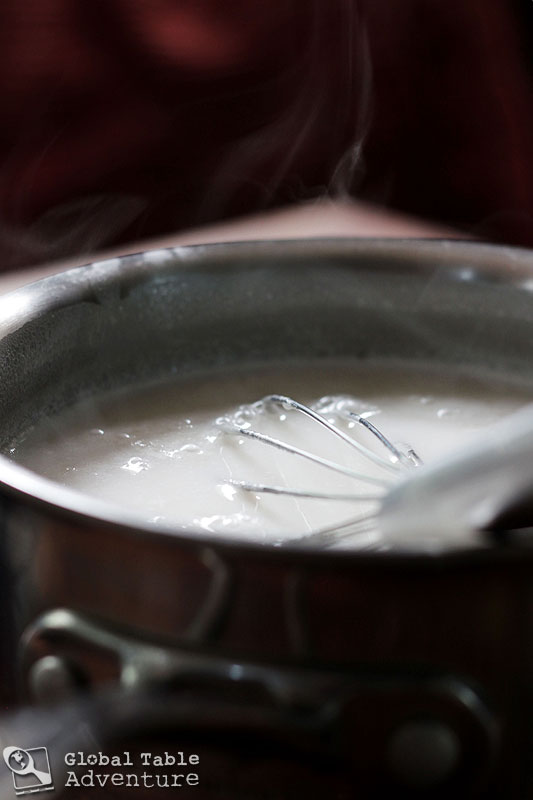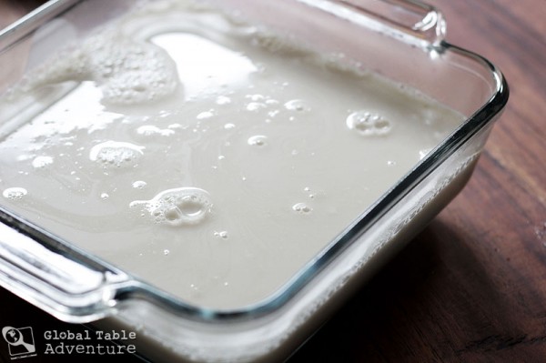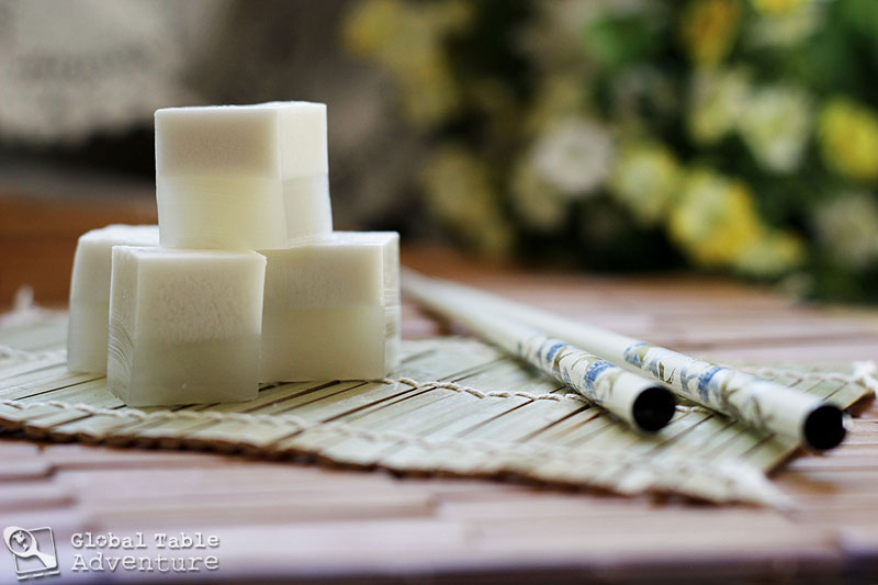 Made with little more than coconut milk, water, sugar, and agar agar, the jello-like dessert sets up firmly, separating into two layers. If you don’t disturb the mixture while it’s setting, the layers will be 50/50 clear/opaque, which is very cute. If, however, you spend 15 minutes furiously whisking the mixture in an an attempt to capture photos of steam.. well… it won’t separate quite as well.