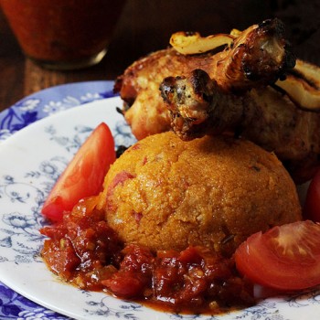 In Togo, corn is everything, ever. Sometimes it is served as porridge. And sometimes it’s served as Djenkoume, a.k.a. cornmeal cakes, a.k.a. edible sand castles. Djenkoume is a cornmeal, tomato, and red palm oil corn cake, rather like polenta. But there’s so much more about the dish… there’s onion, garlic, and ginger in the mix.  And a mound of homemade, spiced tomato sauce.