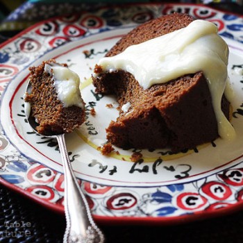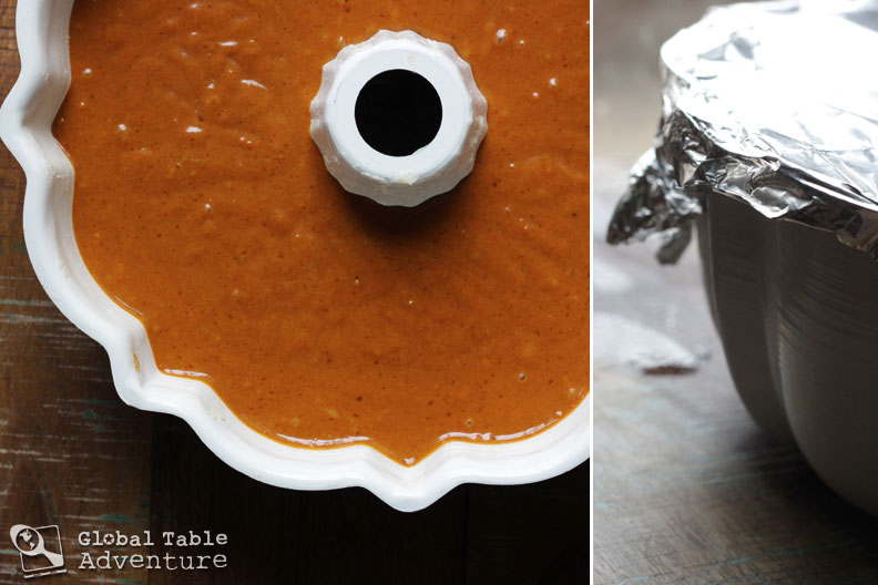 Add the flour and the burnt sugar mixture, alternating about 1/3 of each at a time, scraping sides as needed. When batter is smooth, pour into prepared bundt pan. Cover tightly with foil and bake for about 1 hour – 1 hour & 15 minutes