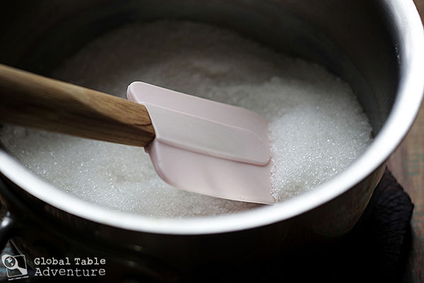 - Cook sugar in a small pot over high heat, stirring constantly, until it turns syrupy brown.