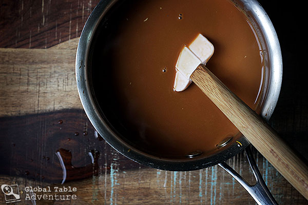 Carefully and slowly add water (it may splatter), then whisk in the evaporated milk. Mine continued to darken as I took this picture… but it still tasted great.