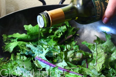 2. Heat oil in a large skillet. Add kale and vinegar. The vinegar gives the bitter greens an upbeat kick! You could even use fresh squeezed lemon juice, if you were in the mood 🙂