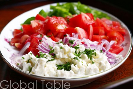 Shopska Salata goes great with Cevapi (little sausages)!