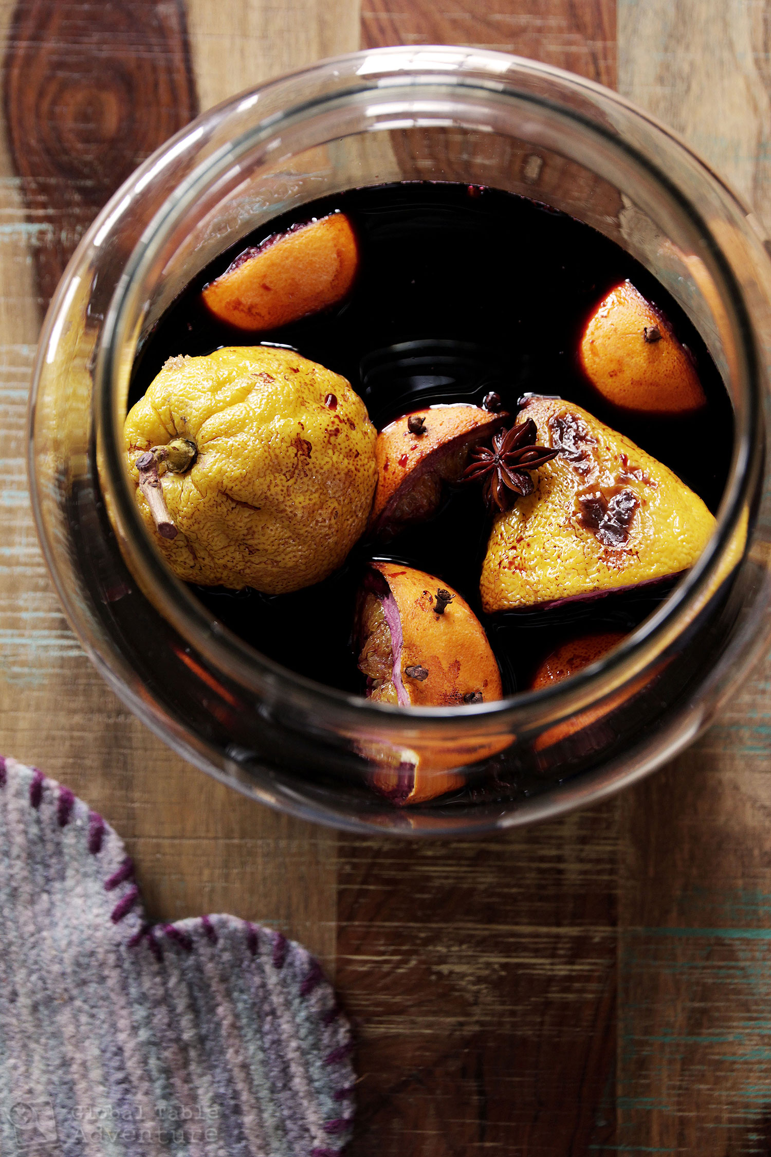 - The next day, remove the fruit and juice it through a strainer set over a large pot. Press the pulp through the strainer as best you can to get every last drop. Discard the fruit skins. Now strain the wine mixture into the same pot. Add the cinnamon sticks and star anise back into the pot. Heat until "smoking" hot (just below a simmer). Add the port and return to "smoking."
