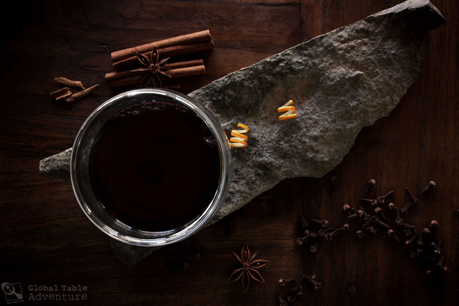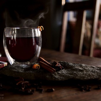 The next day, remove the fruit and juice it through a strainer set over a large pot. Press the pulp through the strainer as best you can to get every last drop. Discard the fruit skins. Now strain the wine mixture into the same pot. Add the cinnamon sticks and star anise back into the pot. Heat until “smoking” hot (just below a simmer). Add the port and return to “smoking.”