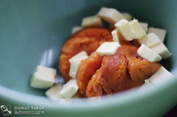 While the sweet potatoes are still very hot, add 3/4 cup to a bowl with the cubed butter. Let the heat of the sweet potatoes melt the butter into happy puddles.