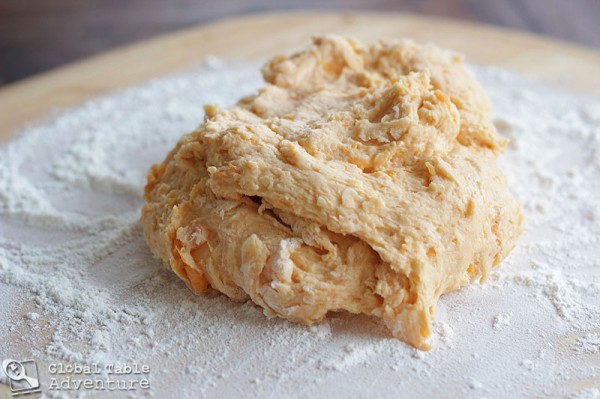Hum a little tune and mix well. The salmon colored dough will be very moist. That’s okay.