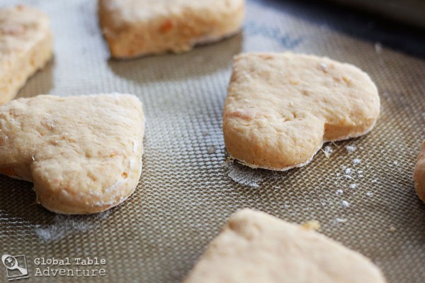 Dip your cookie cutter into flour to keep the biscuit dough from sticking. Afterall, you don’t want to rip your heart apart. Lay the hearts 2″ apart, on a lined baking sheet.
