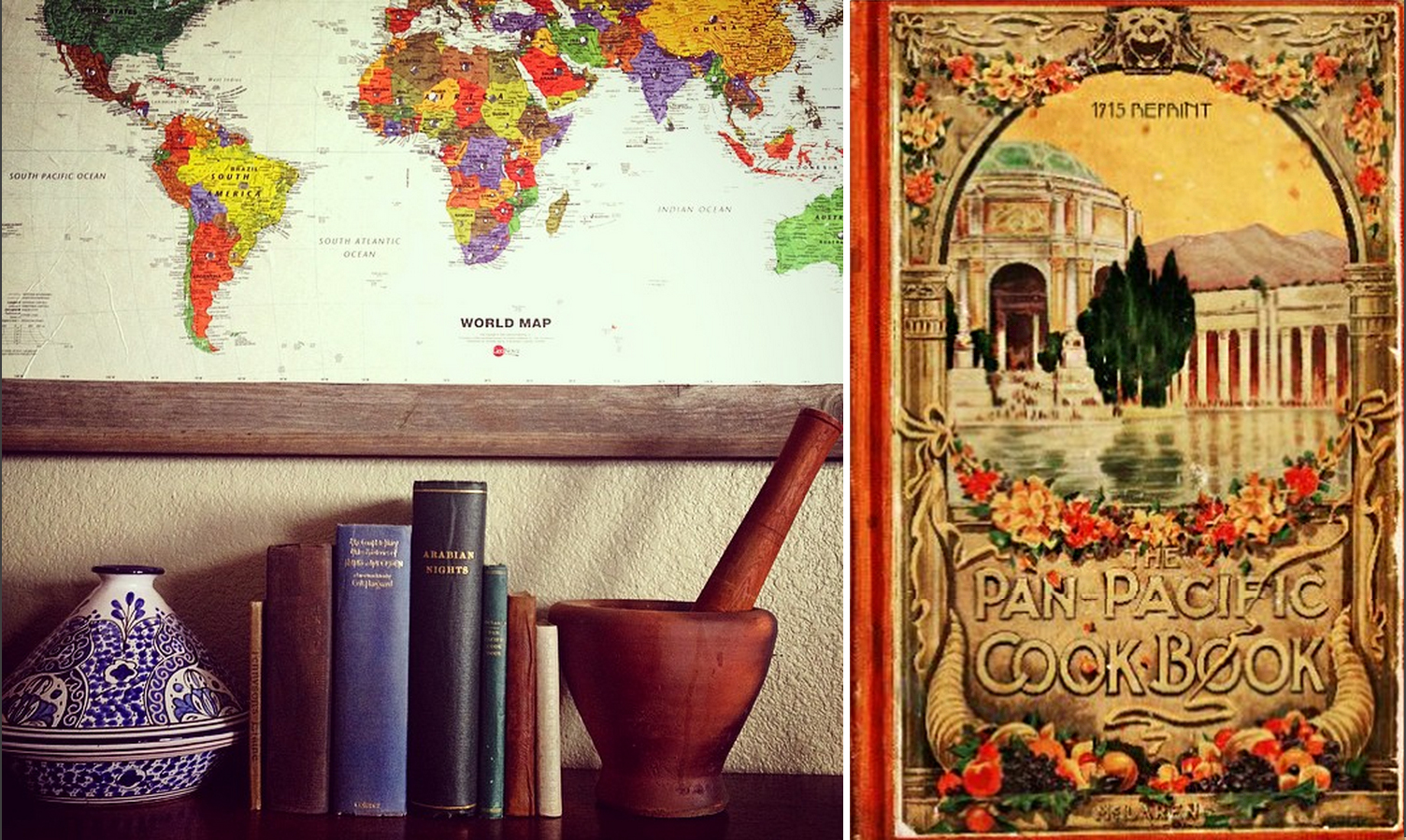 My precious copy of the Pan Pacific Cook Book lives under our world map in the dining room (it’s the short green spine). On the right is a reprint from the same year in red.