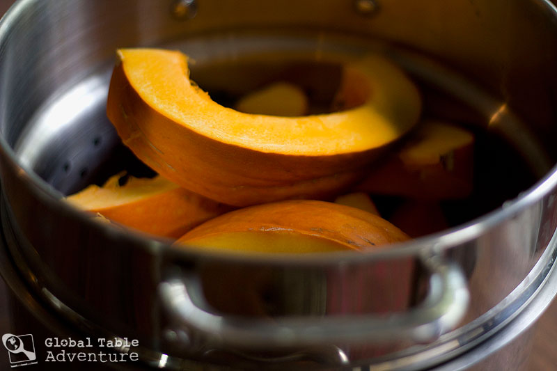 - Cut the pumpkin into strips, remove seeds, and steam until tender, about 30 minutes. I used my giant pasta pot with insert to fit all the pieces. When the pumpkin is soft and slightly cooled, scoop the flesh into a blender until you get about five cups.