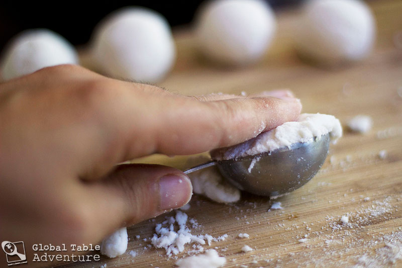 - Meanwhile, make the rice balls by mixing the flour with water until you can shape into dumplings about the size of a teaspoon.