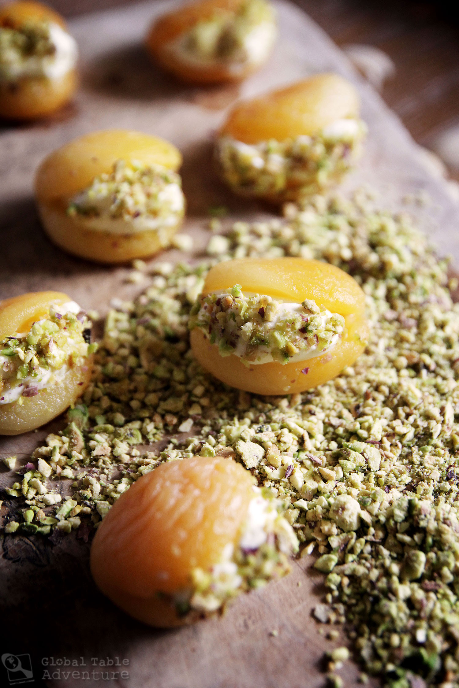 This Turkish appetizer is sweet and creamy - just right for a dinner party or afternoon tea. Start it the night before to soften up the apricots. There are three options for the stuffing, kaymak is the most traditional, while marscapone makes a great substitute. Some use strained Greek yogurt called labneh for this job (regular Greek yogurt will be too runny) - consider sweetening it with a little honey if you want to cut the tart flavor a bit.