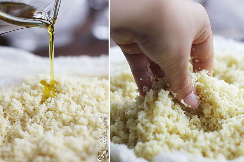 - Now, lift the couscous out of the steamer by holding onto the cheesecloth and lay it all back onto your platter. Drizzle on a 1/2 cup cold water and the olive oil. Work it into the couscous, breaking up any lumps as you go. You may need to use a large fork to rake through the grains if it is too hot for your fingers. Let rest ten minutes. Break up any lumps.