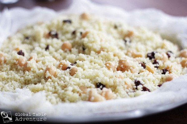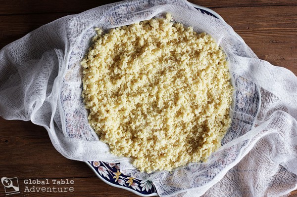 First, rinse couscous in a large bowl of water. Drain and spread couscous over a double layer of cheesecloth (or a linen cloth) on a large large, flat tray or platter. This gives the couscous room to fluff up evenly.