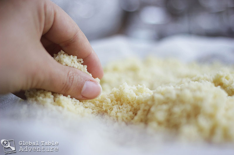 - First, rinse couscous in a large bowl of water. Drain and spread couscous over a double layer of cheesecloth (or a linen cloth) on a large large, flat tray or platter. This gives the couscous room to fluff up evenly.