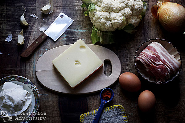 I’m fairly confident Dracula would have loved this bacon-loaded, cheese sprinkled cauliflower casserole (perhaps without the garlic). With lots of bacon and sour cream, it’s classic Romanian cooking at it’s finest. I like to imagine him eating the casserole at dusk, collar raised against the bitter winter winds that whipped through his castle grounds. Most authentic recipes call for cheese called cascaval, for which I used a blend of Emmental and Cheddar which made for an amazing creamy, half-sharp blend. The sour cream and egg serve as a binder and make this dish a little more finished for potlucks and larger gatherings.