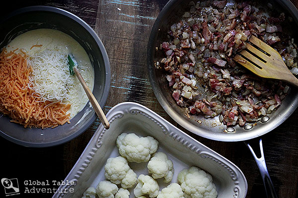 After taking in these glorious views, steam the cauliflower in florets (this took 6-10 minutes for me). Be careful not to overcook it. Then preheat the oven to 375F and begin frying up the bacon. Breathe in the aroma of goodness.