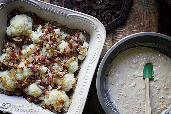 3. Place the steamed cauliflower in a small casserole, top with the bacon and onion. In a small bowl, mix together the eggs, sour cream, cheese, salt, pepper, and paprika. Pour over the top of the cauliflower.