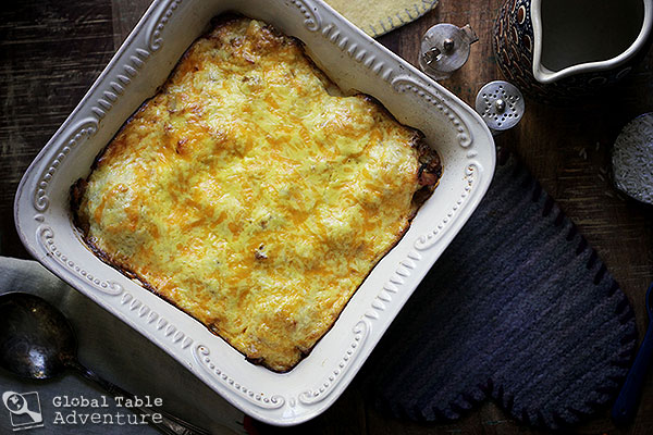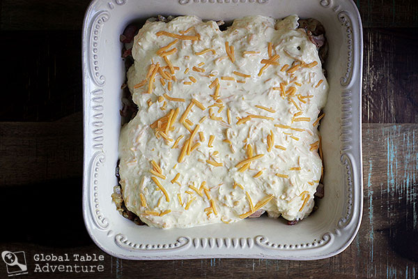 Based on this definition  I used a blend of Emmental and Cheddar which made for an amazing creamy, half-sharp blend. The sour cream and egg serve as a binder and make this dish a little more finished for potlucks and larger gatherings.
