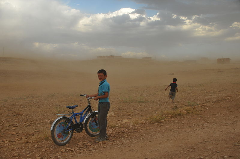 Kurdish children in dust storm locally called “Ecac” at Quzêrîb. Photo by Dûrzan.
