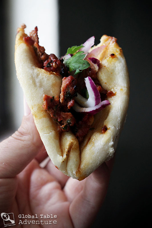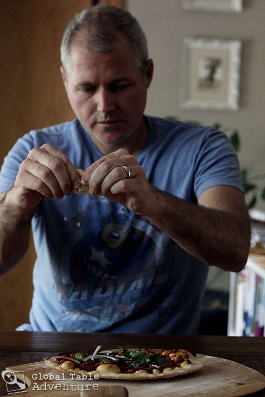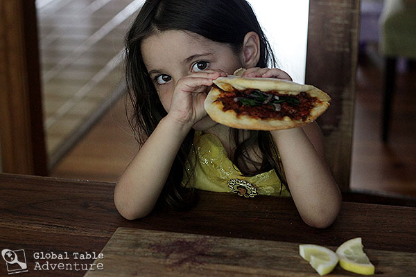 3. Add a bunch of your favorite Turkish toppings. Mr Picky liked red onion, parsley, lemon juice, sumac, and a bit of mint. Turkish pizza is traditionally folded or rolled, which makes for a fun, picnic-style dinner.