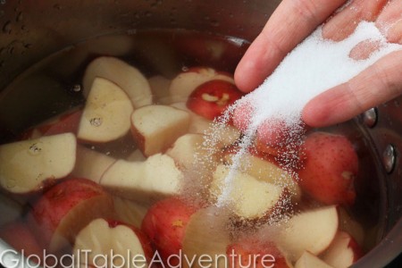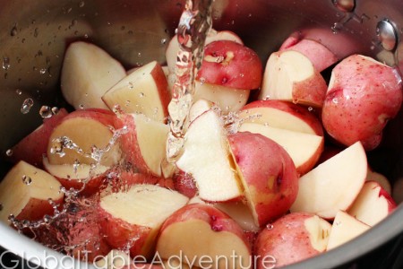 - Place potatoes in a pot with water and cook thoroughly.