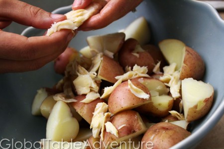 One drained, flake the salt cod over the potatoes.