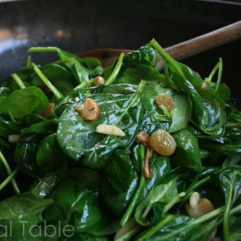 Wild mushrooms give this spinach salad Andorran appeal. The crunch of slivered almonds and the sweet of the golden raisins add another dimension.