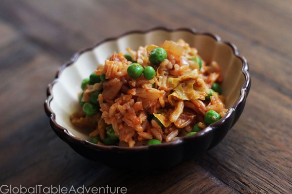 Next, pile on the chopped cabbage. Stir and cook until weird and wilted. You’re making room for the rice.
