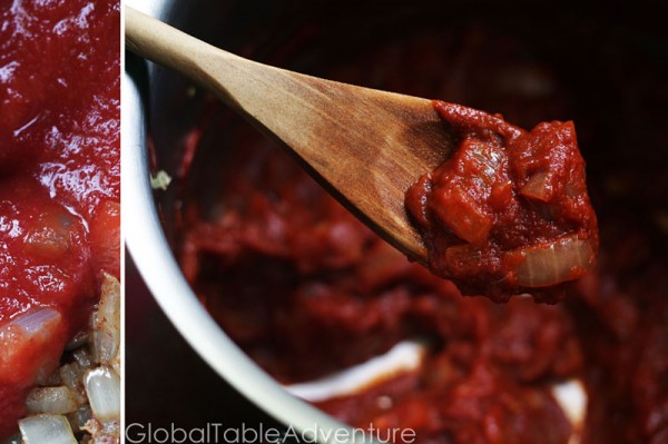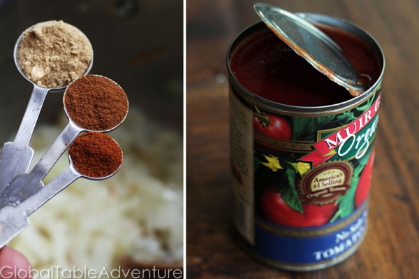 - Cook the garlic and onion in a medium/large pot with a bit of vegetable oil. When they are softened, toss on the spices and tomato sauce/puree.